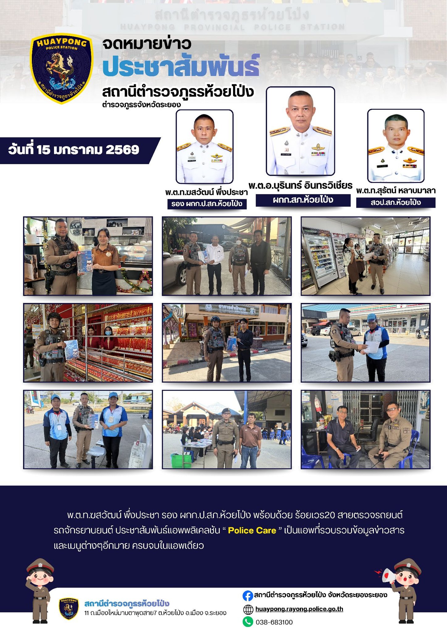 วันที่ 19 มี.ค. 68 เวลา 17.30 น. •พ.ต.อ.ตรงศักดิ์ เพชรหาญ ผกก.สภ.ห้วยโป่ง •พ.ต.ท.วัชรพล ไวยสุศรี รอง