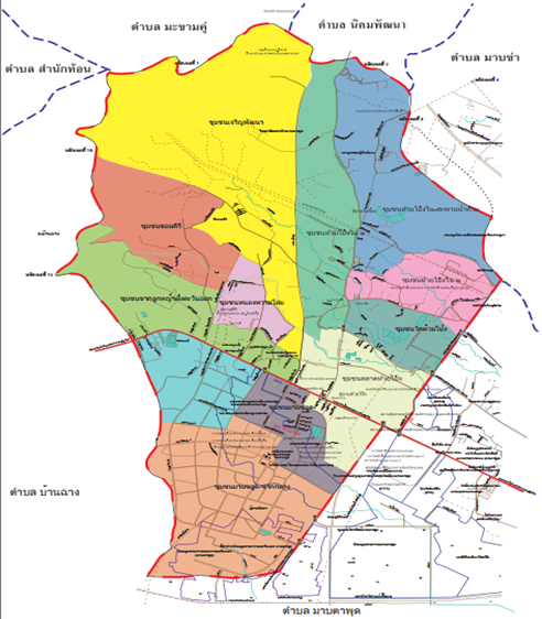 1) ทิศเหนือ ติดต่อกับตำบลมาบข่า อำเภอนิคมพัฒนา จังหวัดระยอง สภ.นิคมพัฒนา